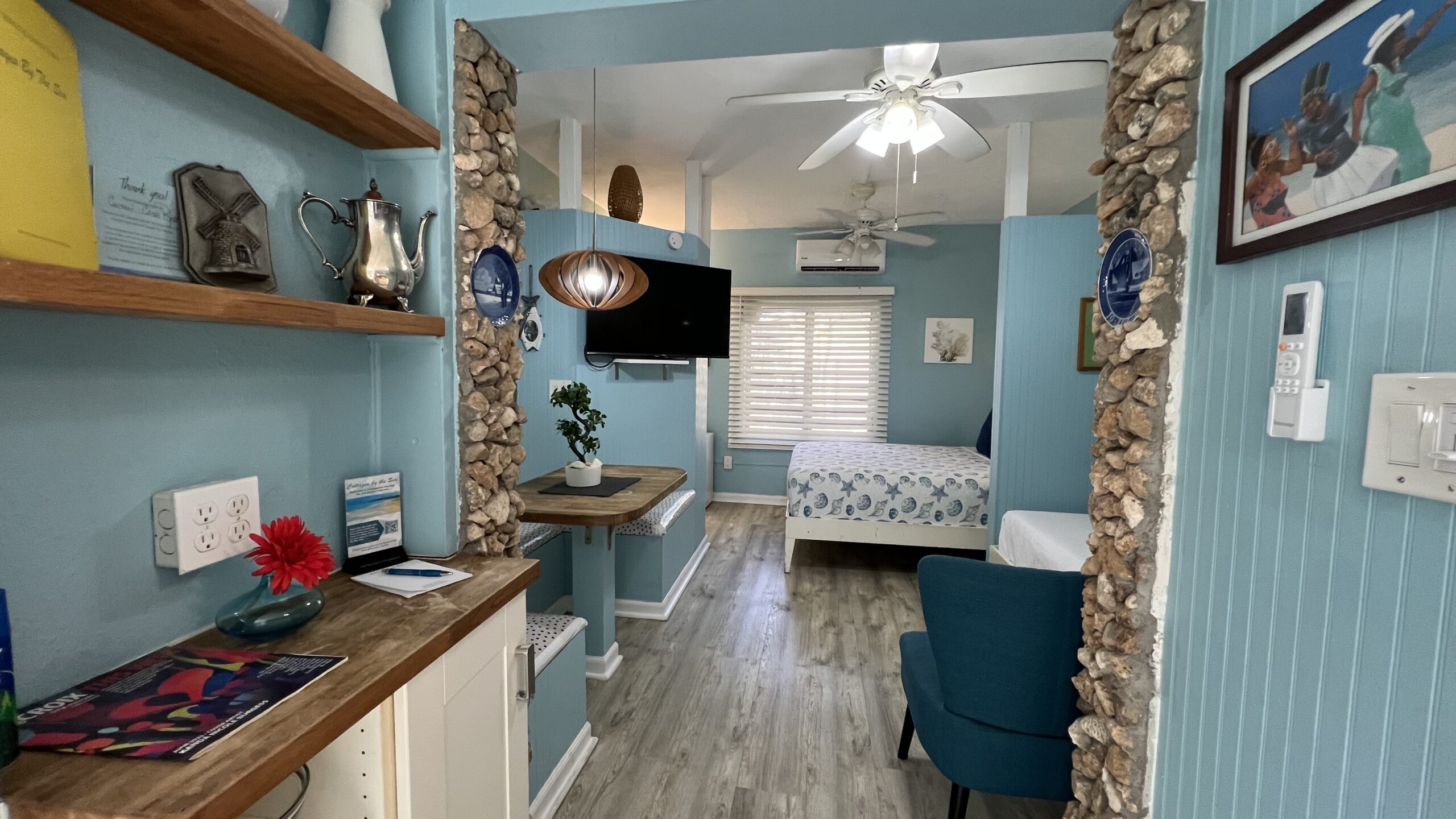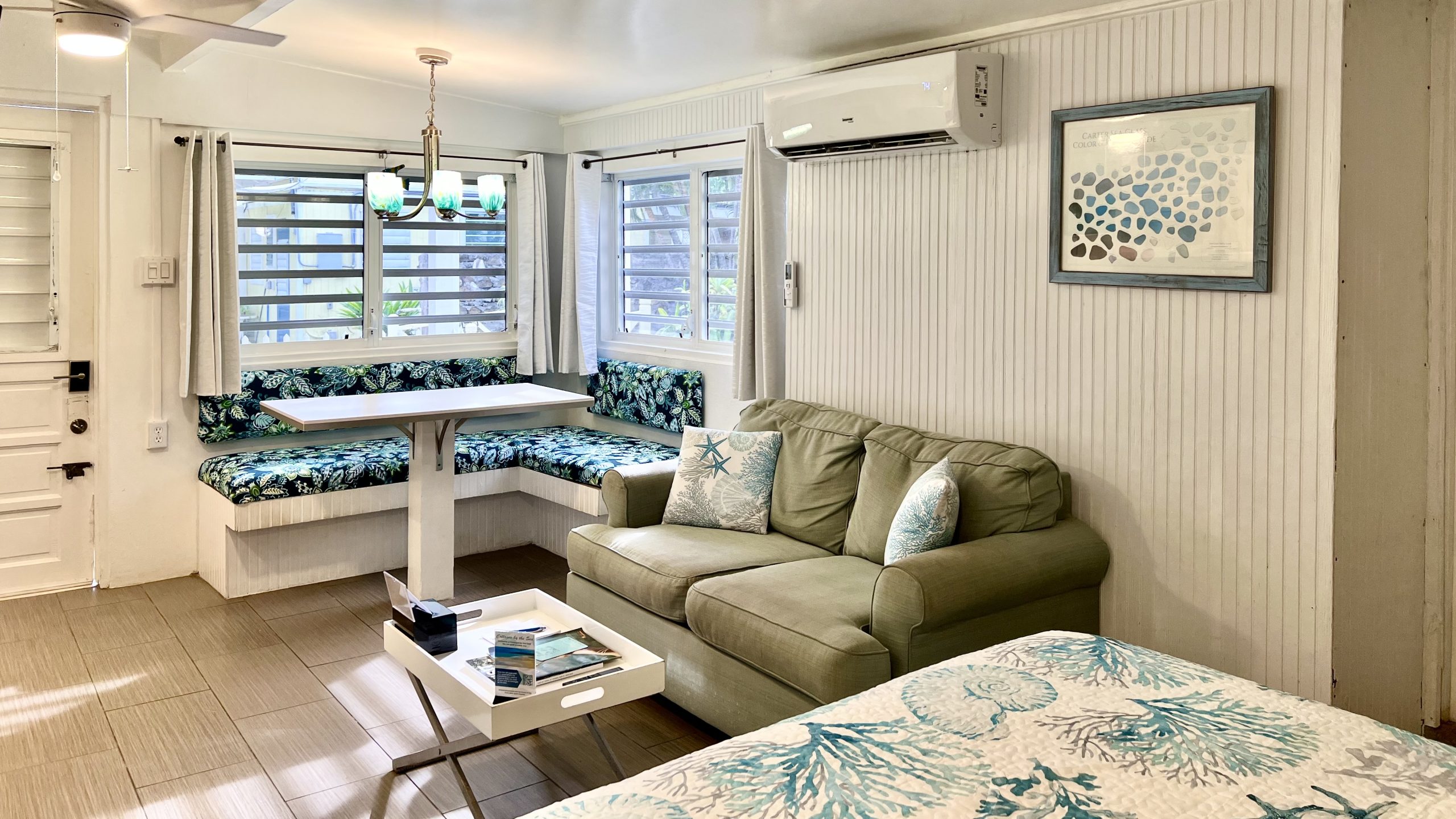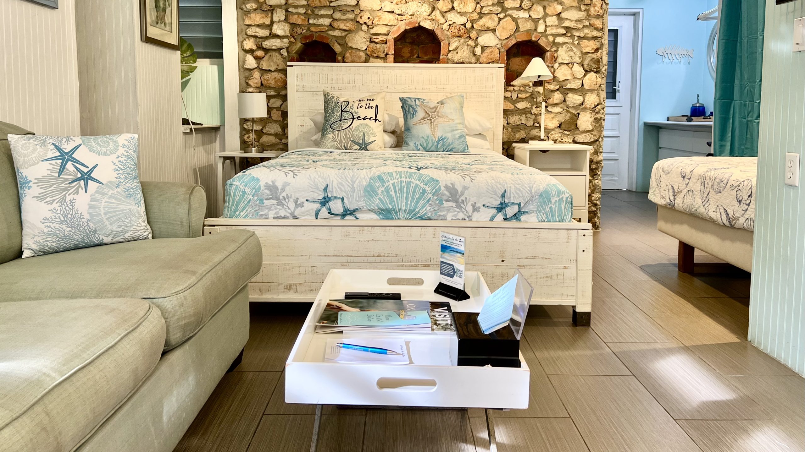Located between our Caravelle and Commodore’s Villa Cottages, Seaglass Cottage is a guest favorite and is decorated with the colors of the sea glass that guests gather from our beach. This cottage has an open concept floorplan and features a built-in dining booth, a queen and twin bed, a decorative rock wall, a galley kitchen, and a spacious bathroom. When sitting on the outdoor, covered porch, there is a slight view of the sea.