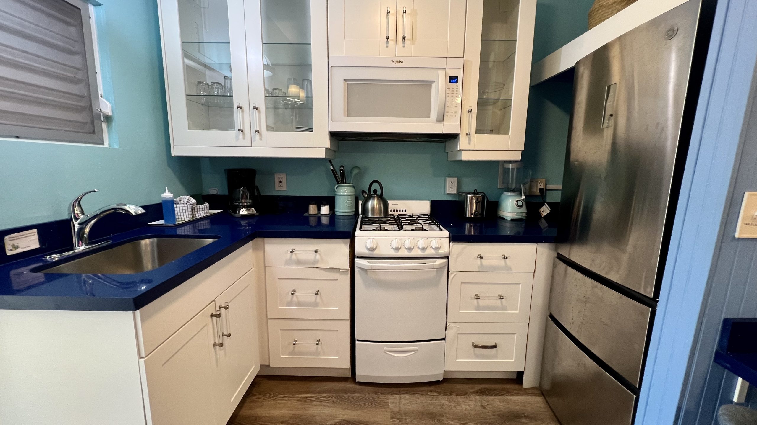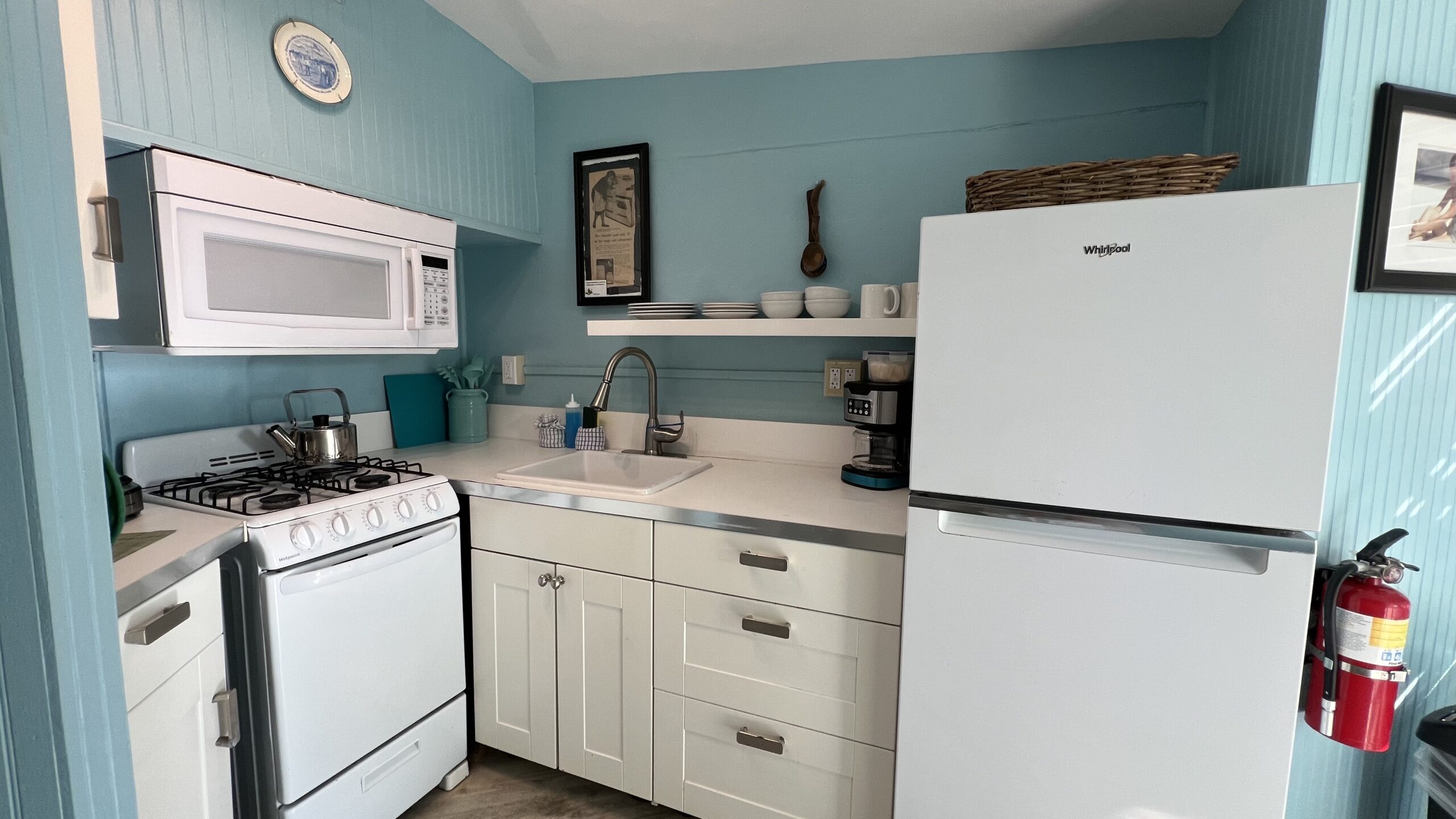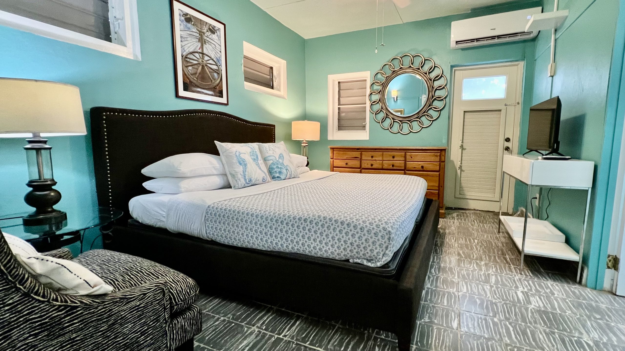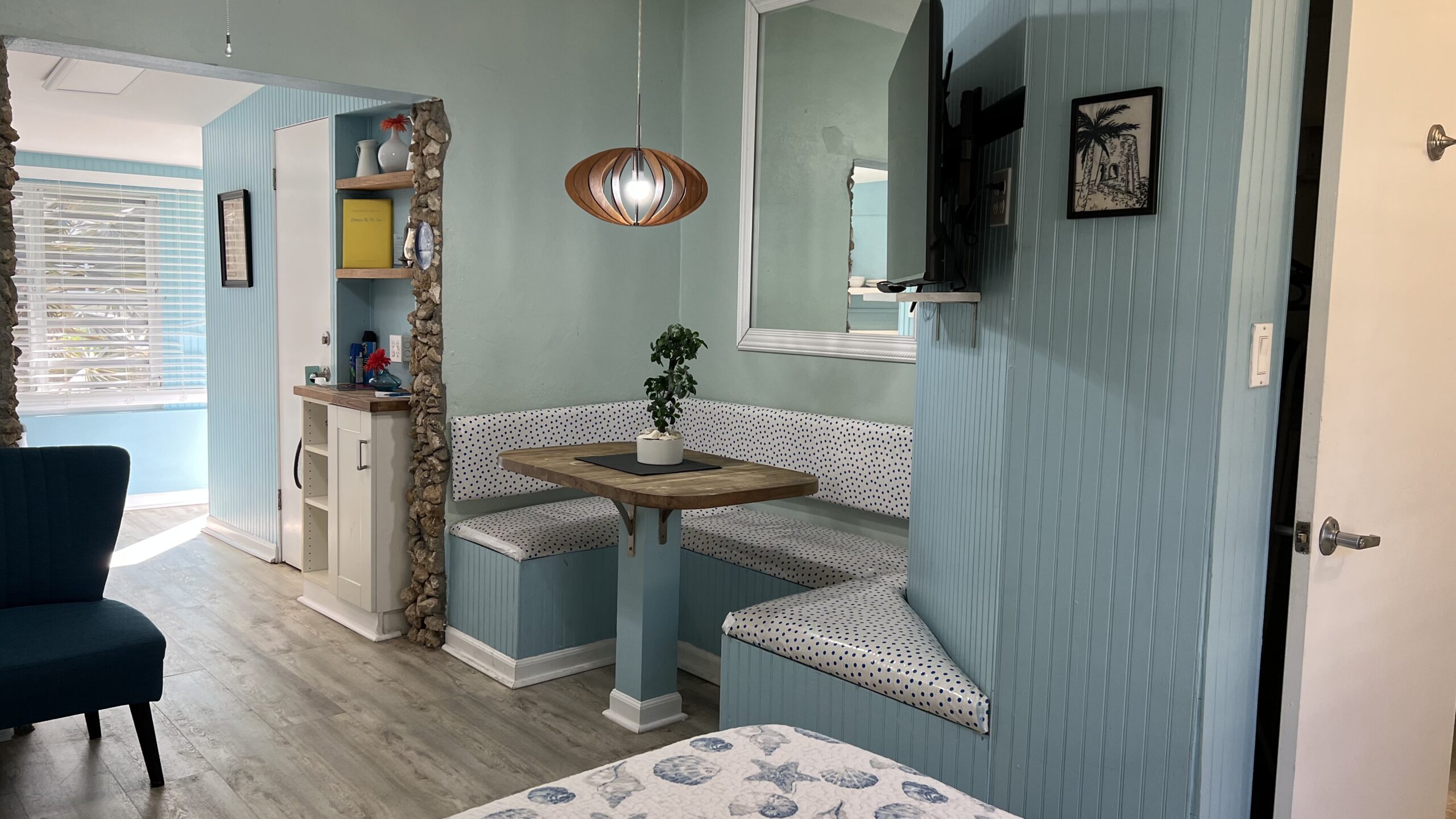 Located between our Caravelle and Commodore’s Villa Cottages, Seaglass Cottage is a guest favorite and is decorated with the colors of the sea glass that guests gather from our beach. This cottage has an open concept floorplan and features a built-in dining booth, a queen and twin bed, a decorative rock wall, a galley kitchen, and a spacious bathroom. When sitting on the outdoor, covered porch, there is a slight view of the sea.