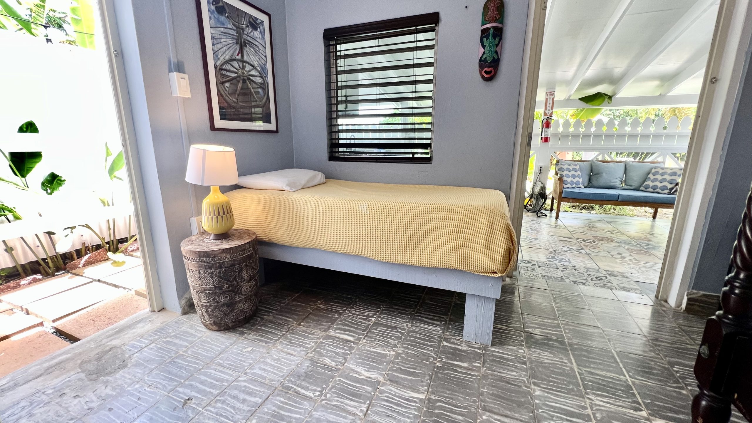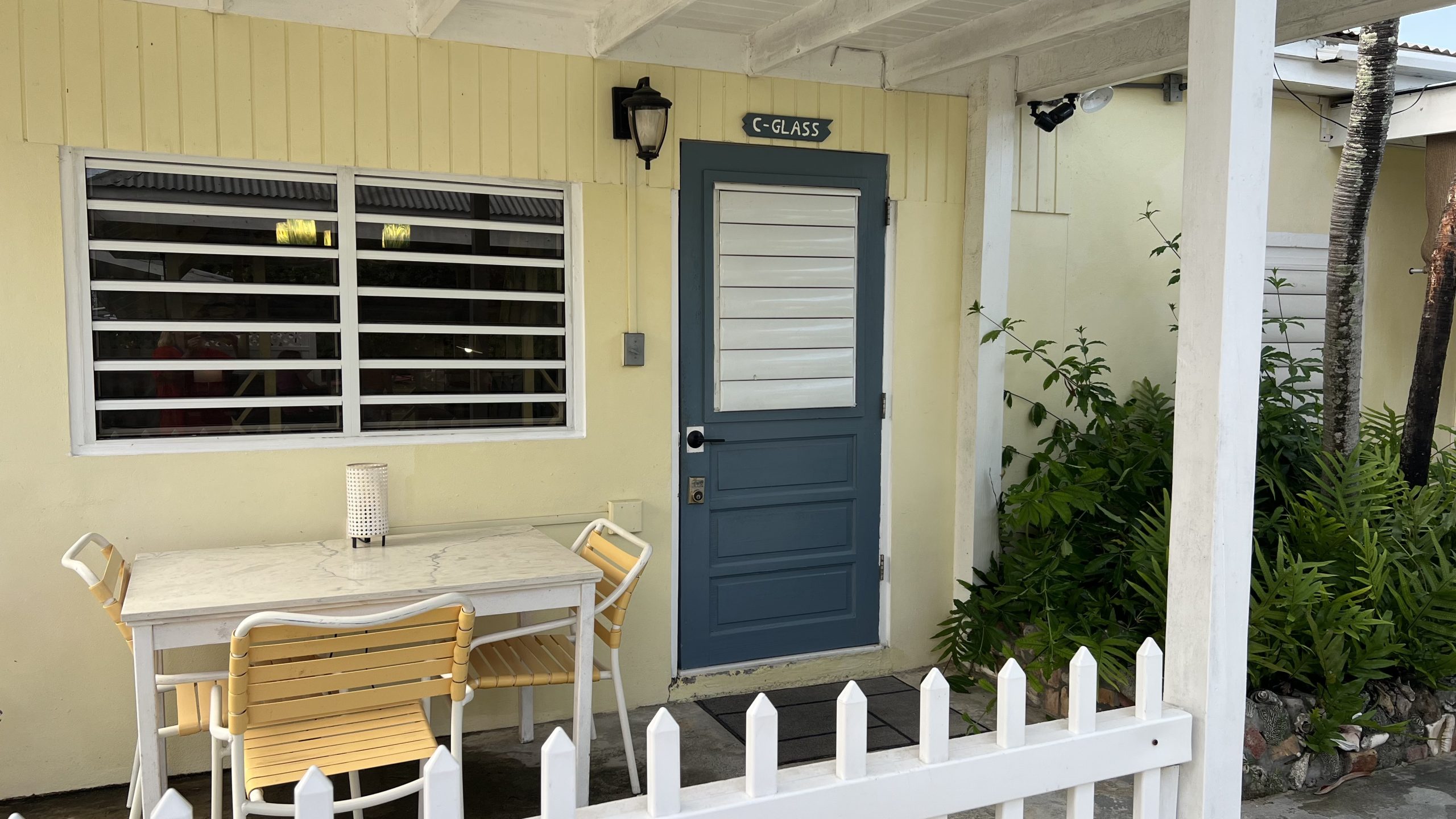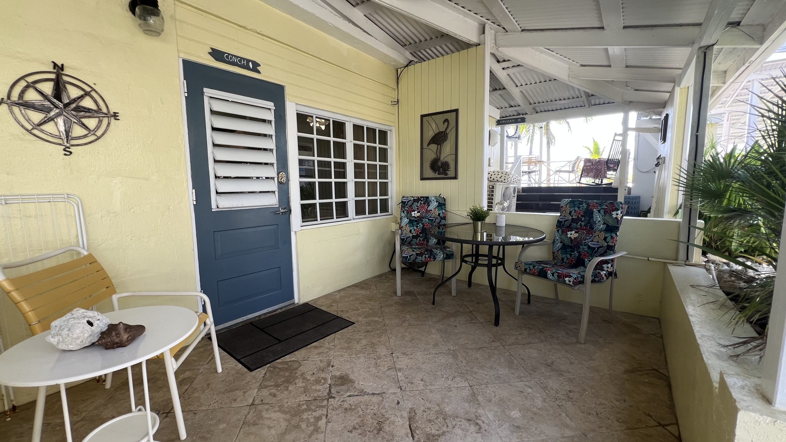 Cockle Shell is the middle of our three “shell” cottages and has an adjoining door to our Cowry Shell Cottage. This bright and colorful cottage has an open concept floorplan with a kitchen, queen and twin beds, and a bathroom with a walk-in shower. The outdoor patio is small and cozy. Cockle Shell has an adjoining door to our Cowry Shell cottage.