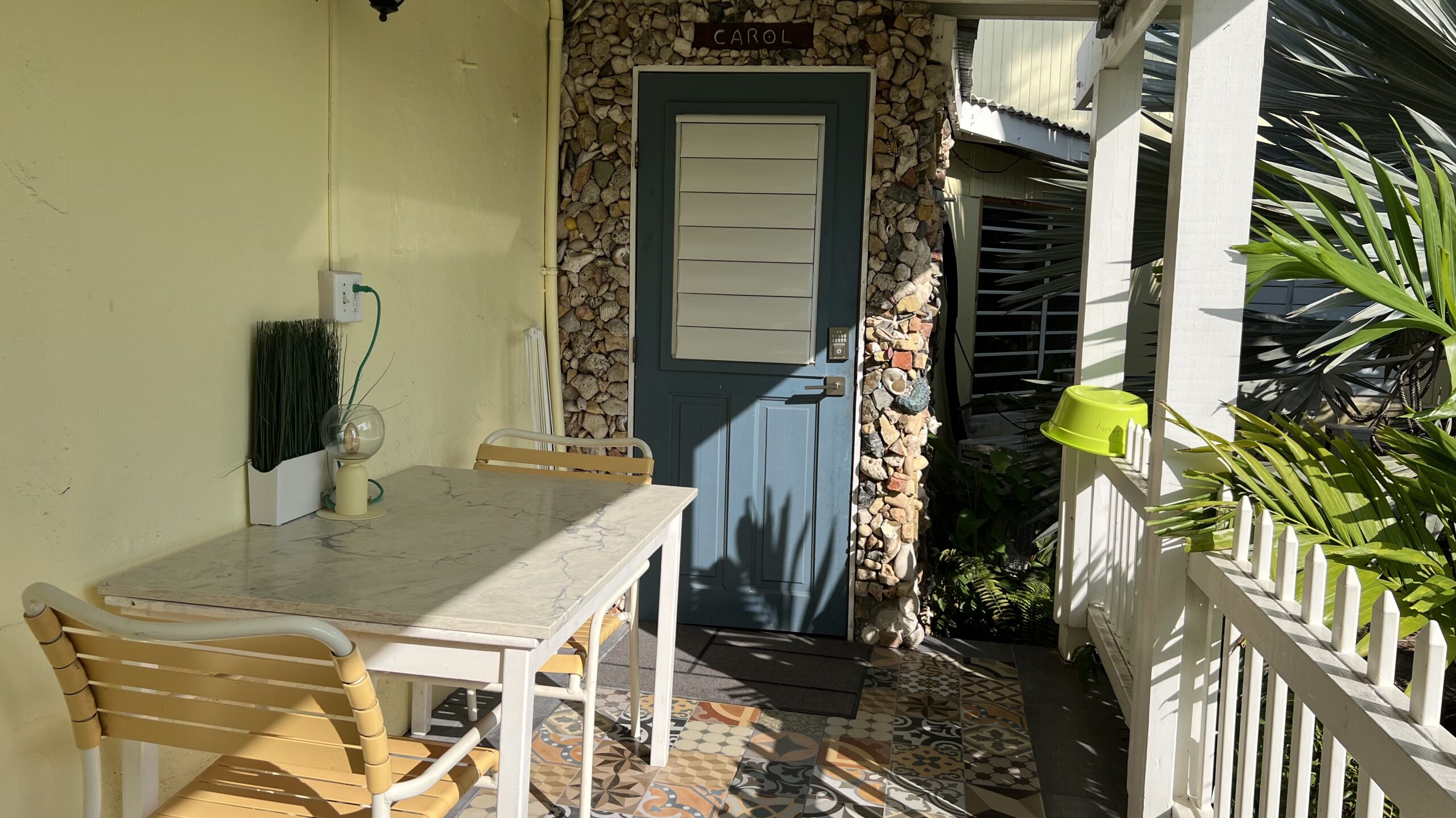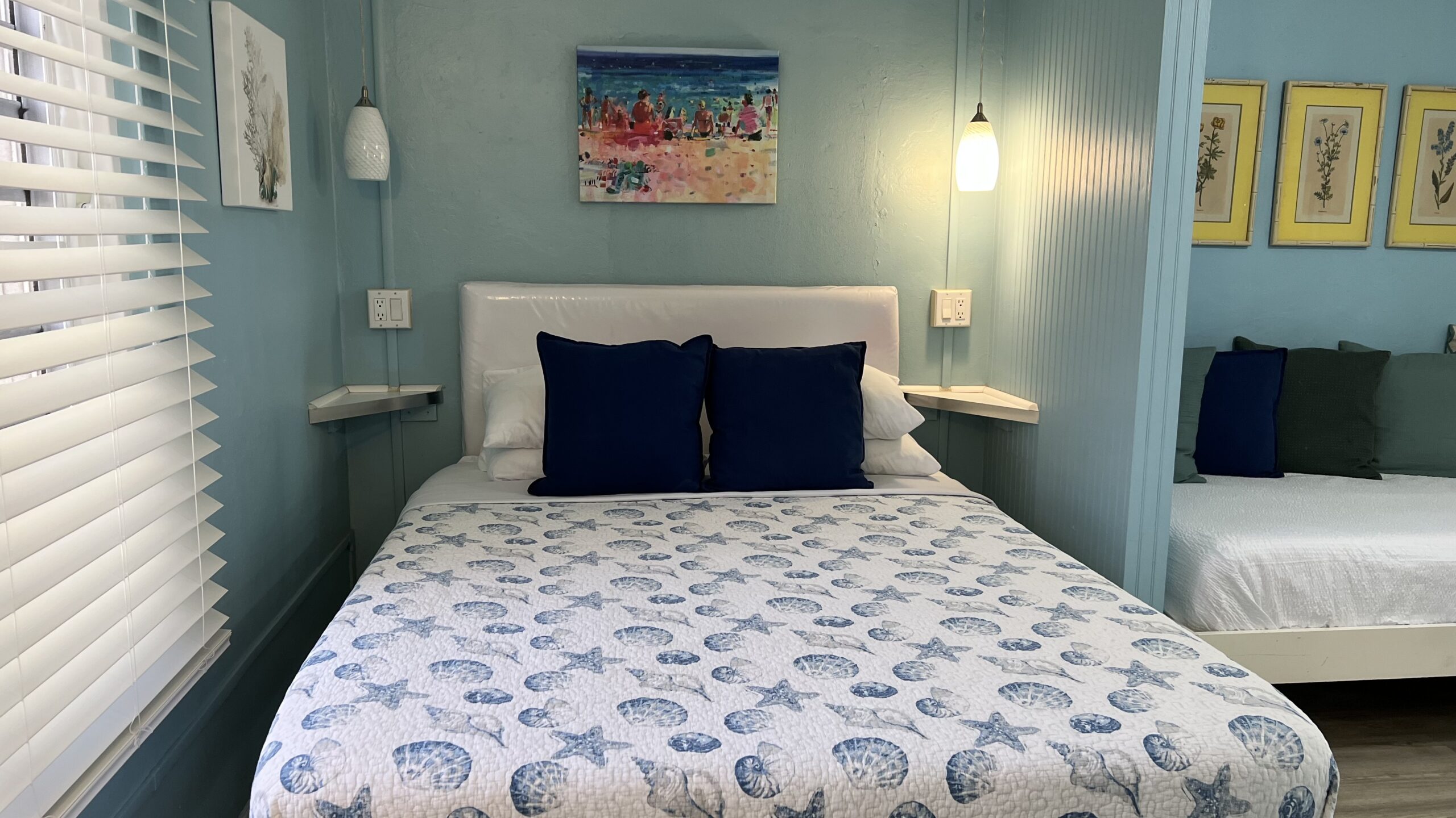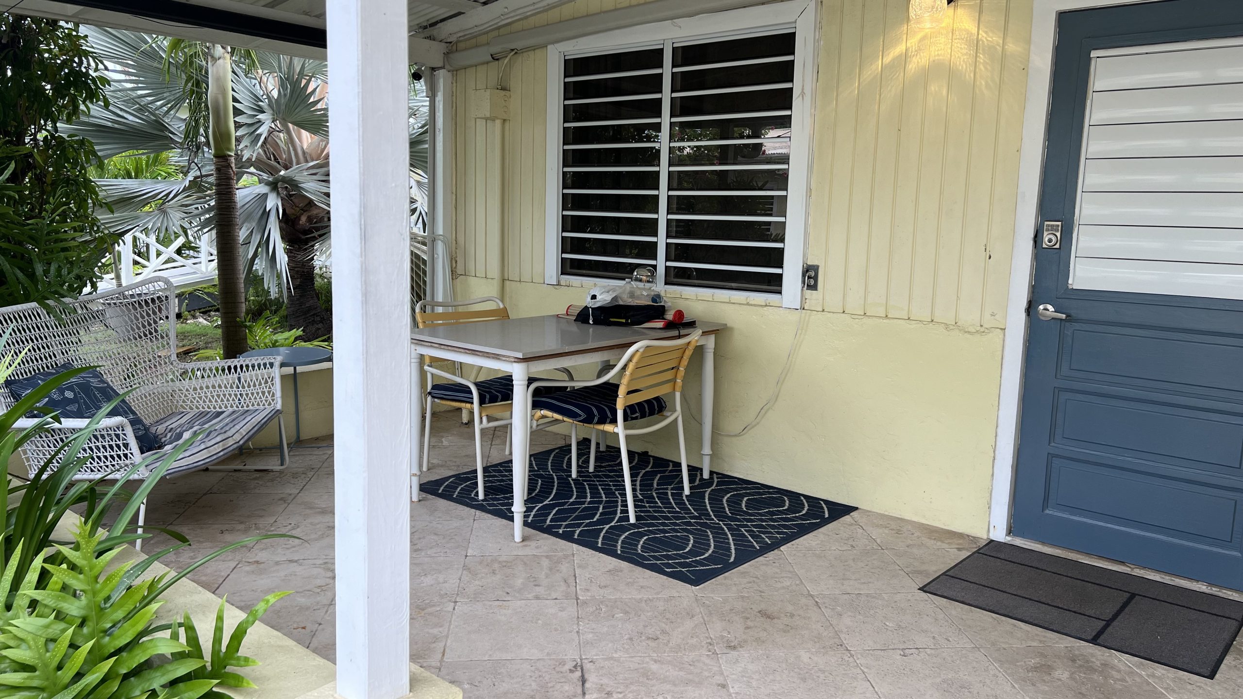 Cockle Shell is the middle of our three “shell” cottages and has an adjoining door to our Cowry Shell Cottage. This bright and colorful cottage has an open concept floorplan with a kitchen, queen and twin beds, and a bathroom with a walk-in shower. The outdoor patio is small and cozy. Cockle Shell has an adjoining door to our Cowry Shell cottage.