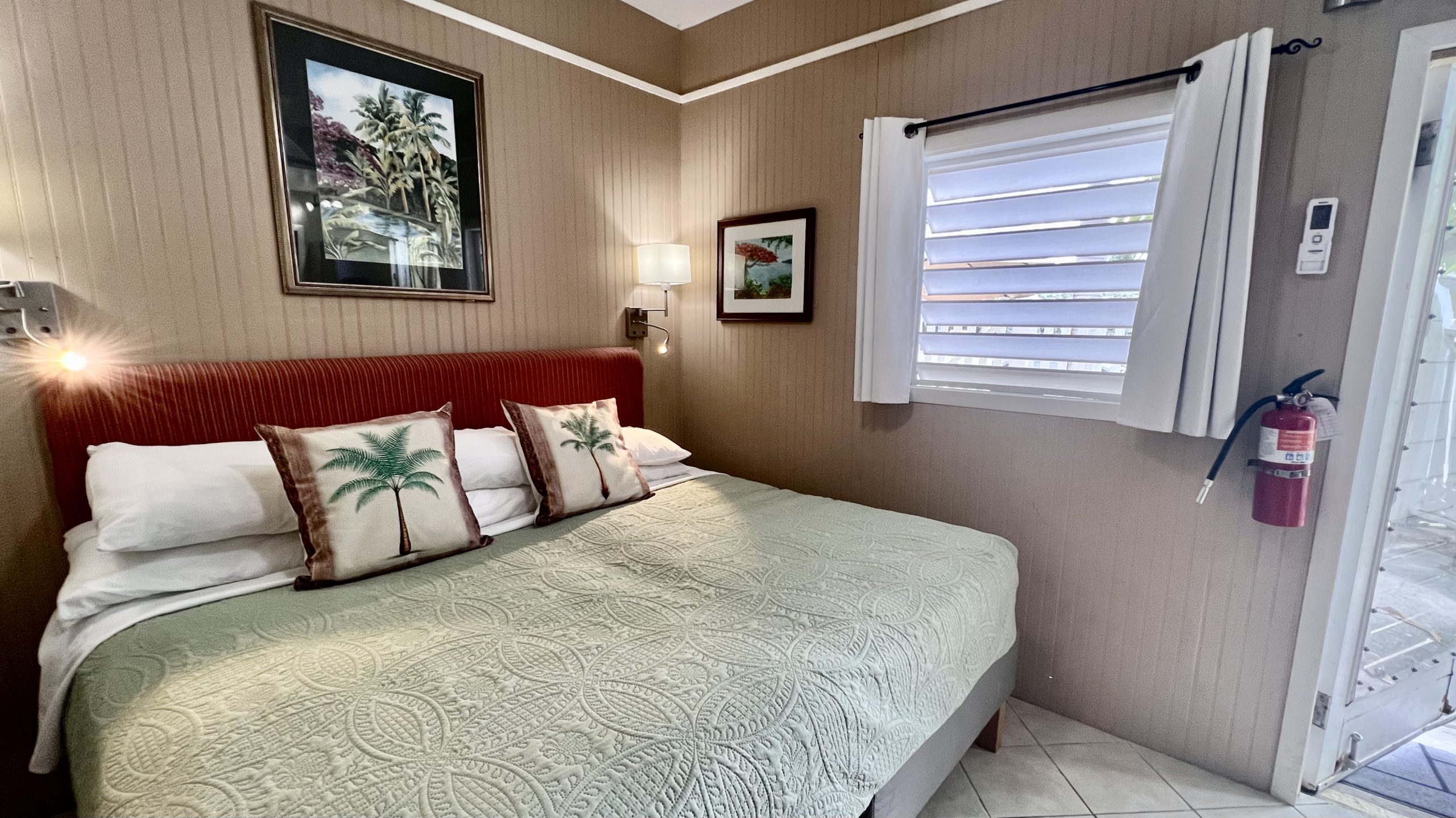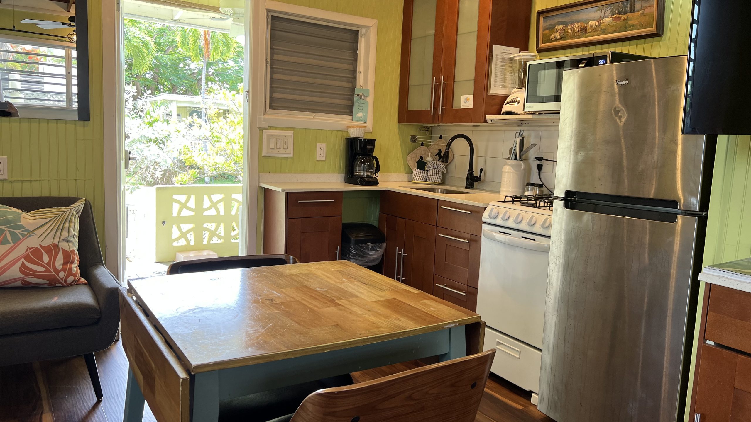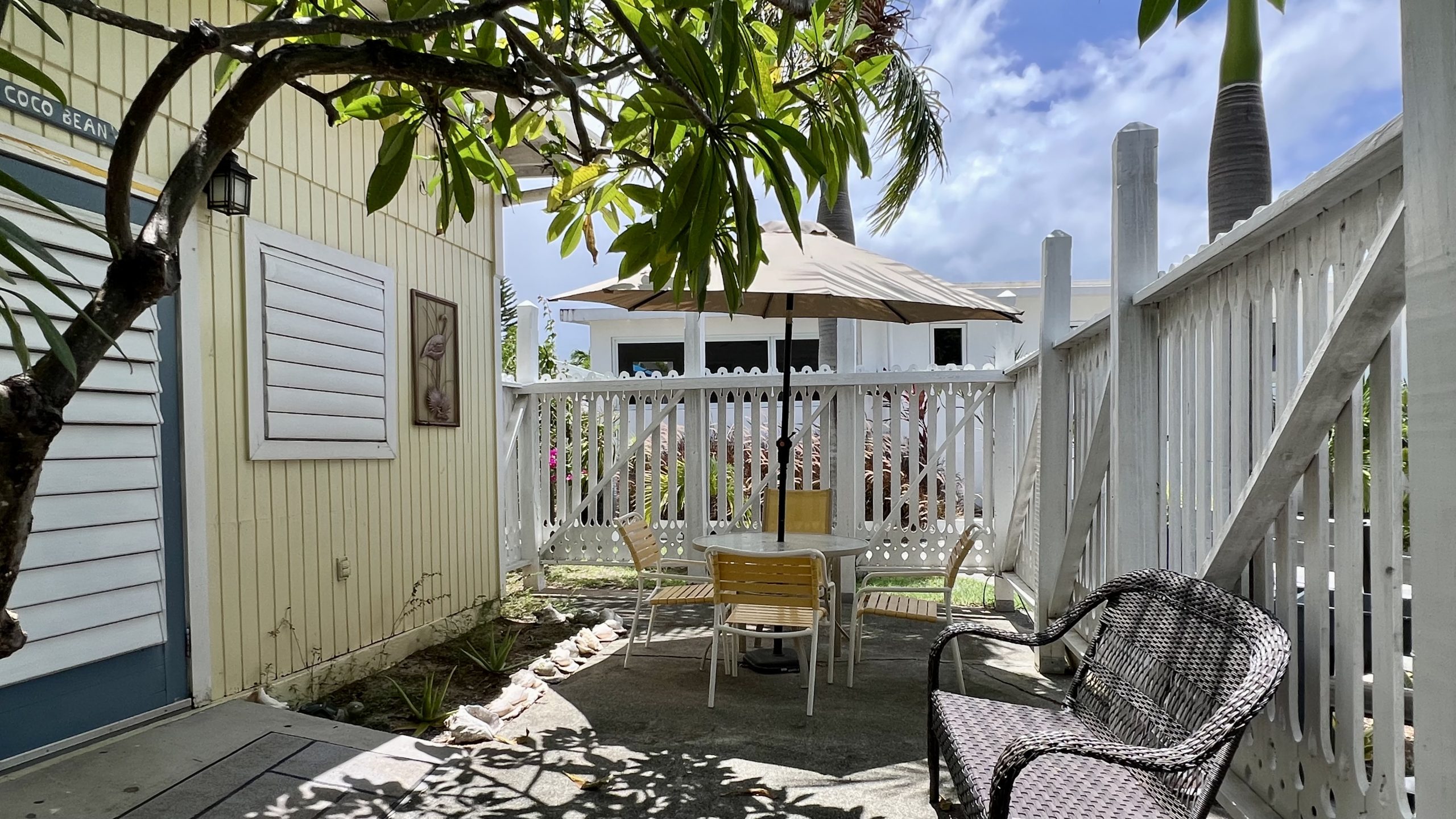 Coco Bean room is located on the back side of our Coco Palm Cottage, but with an entrance from our main parking lot. It has an adjoining door to our Coco Palm Cottage. Coco Bean is a very small room without a kitchen and has a king bed that can be separate into two twin beds. It has an outdoor sitting area, but does not have a porch or patio.