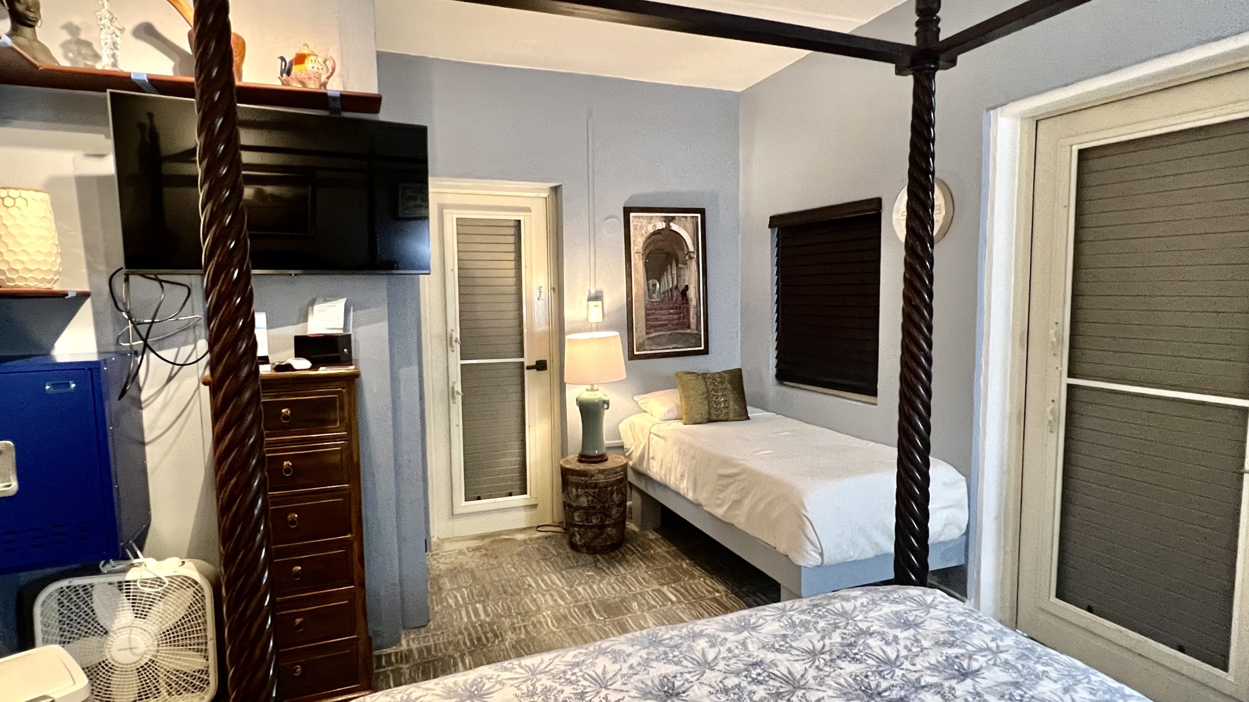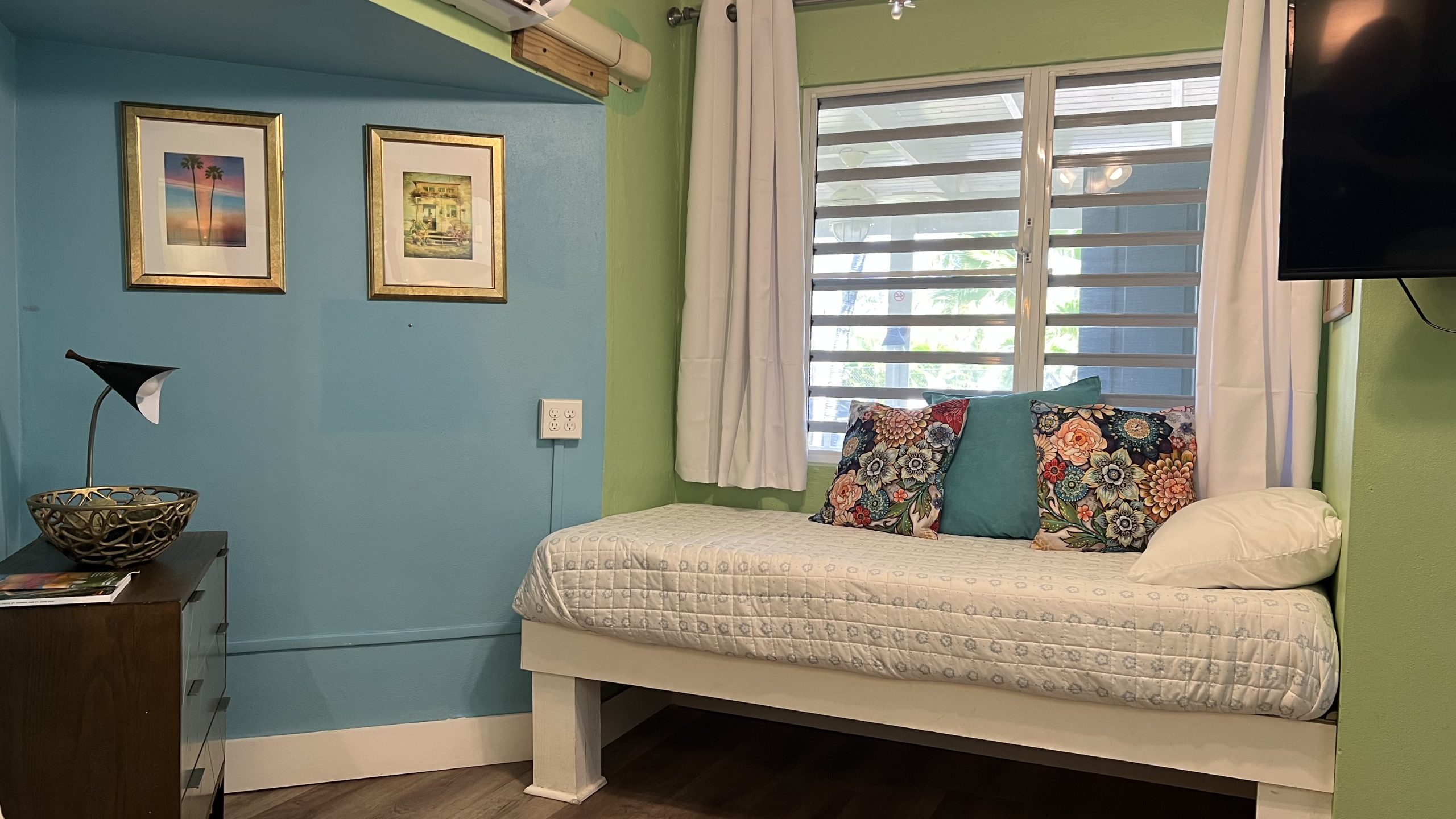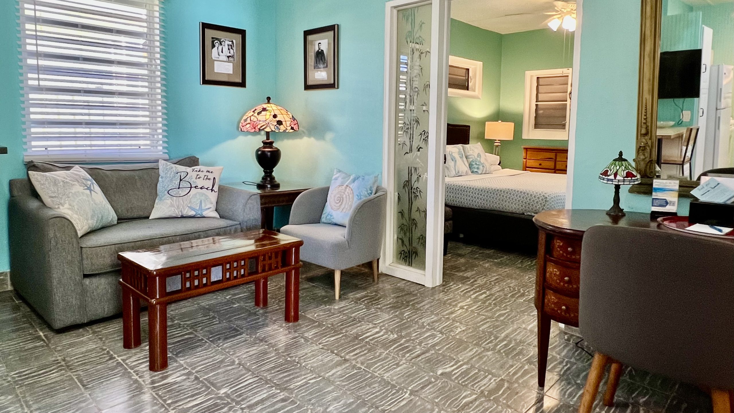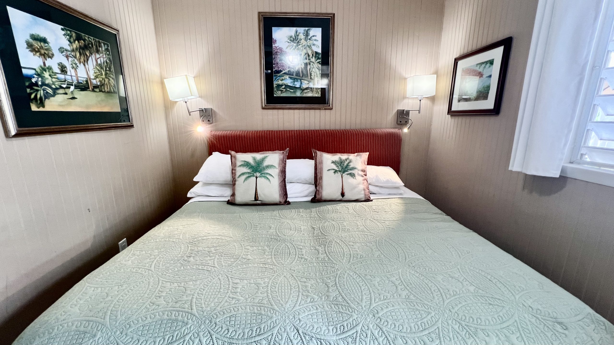 Coco Bean room is located on the back side of our Coco Palm Cottage, but with an entrance from our main parking lot. It has an adjoining door to our Coco Palm Cottage. Coco Bean is a very small room without a kitchen and has a king bed that can be separate into two twin beds. It has an outdoor sitting area, but does not have a porch or patio.