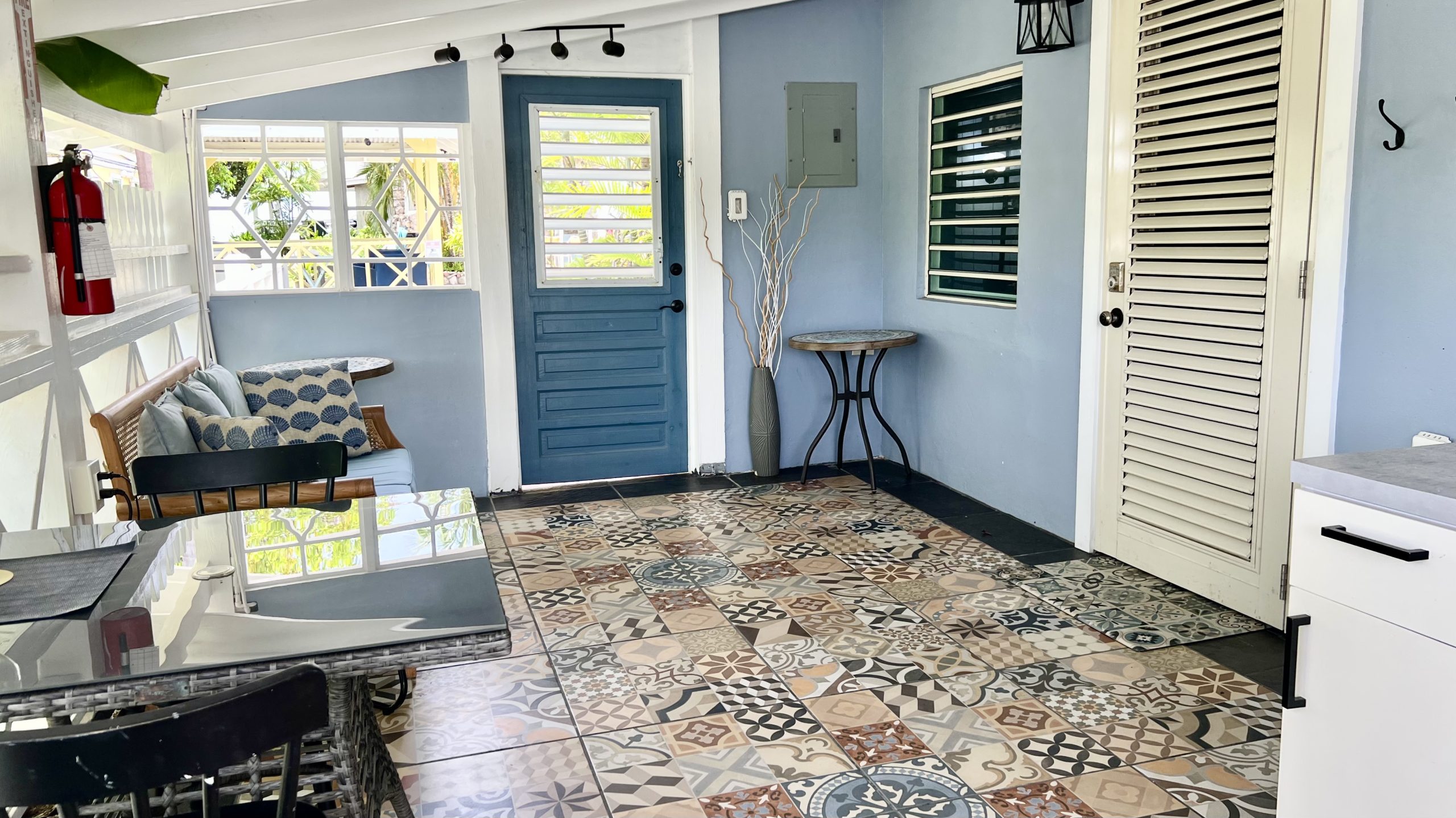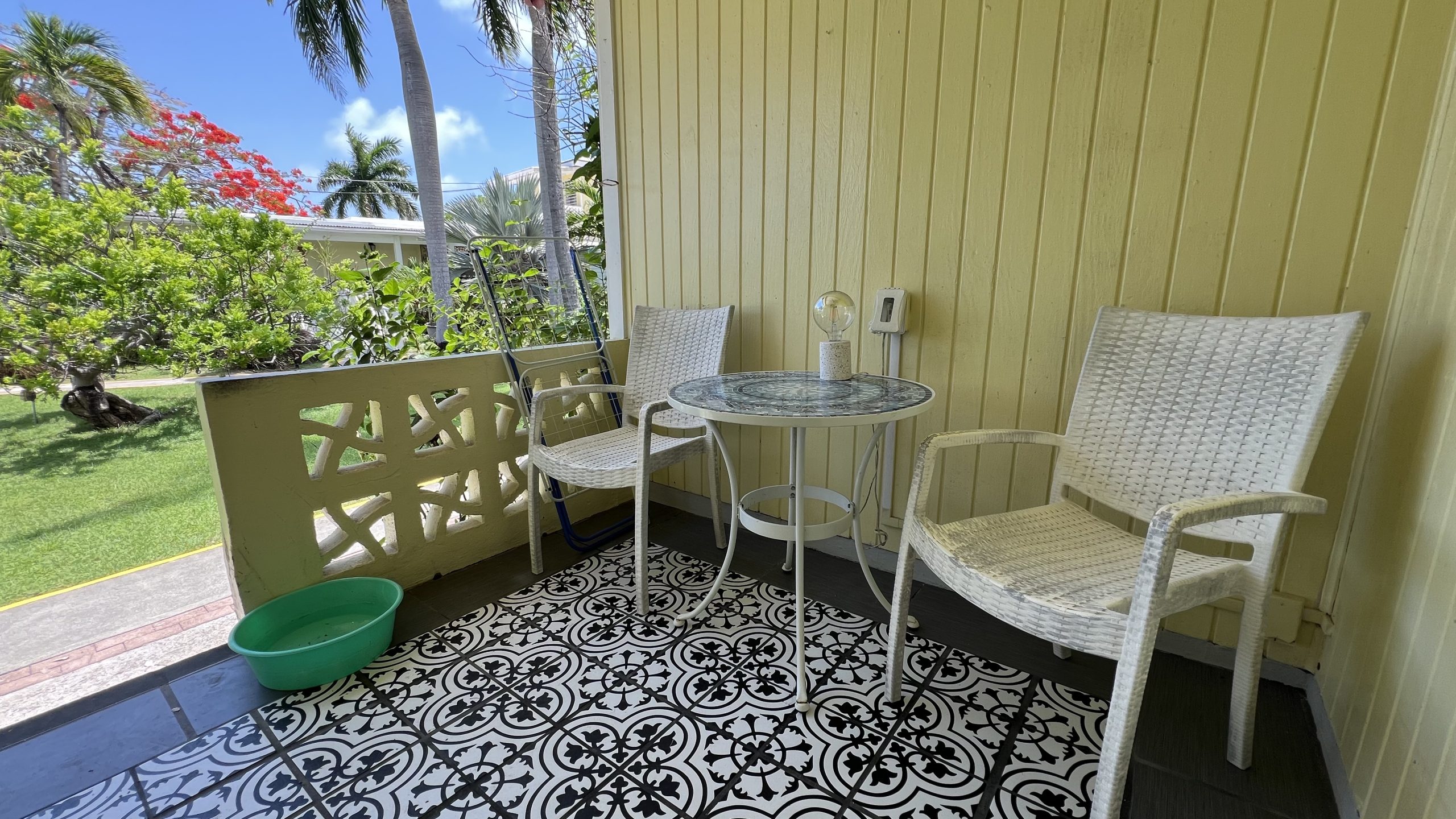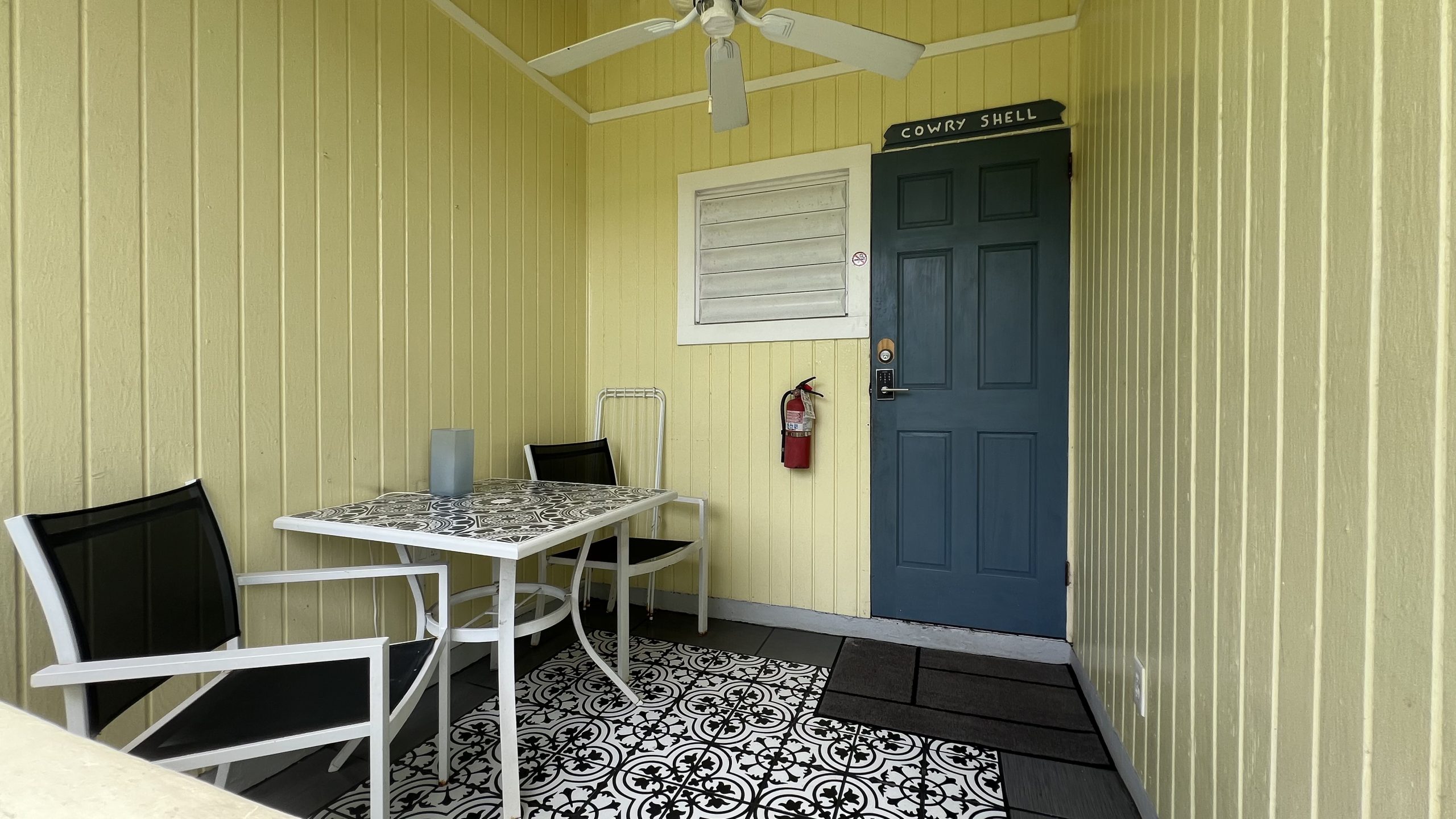 Cowry Shell Cottage is an end cottage with plenty of windows for breezes. It is located next to our Cockle Shell Cottage. Cowry Shell has bright colors, an open concept floor plan with queen and twin beds, a nice kitchen, and a spacious bathroom. The outdoor patio is small and cozy. Cowry Shell has an adjoining door to our Cockle Shell cottage.