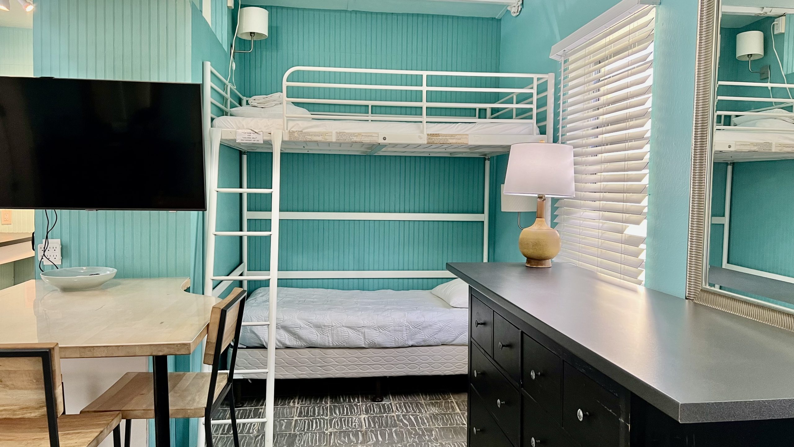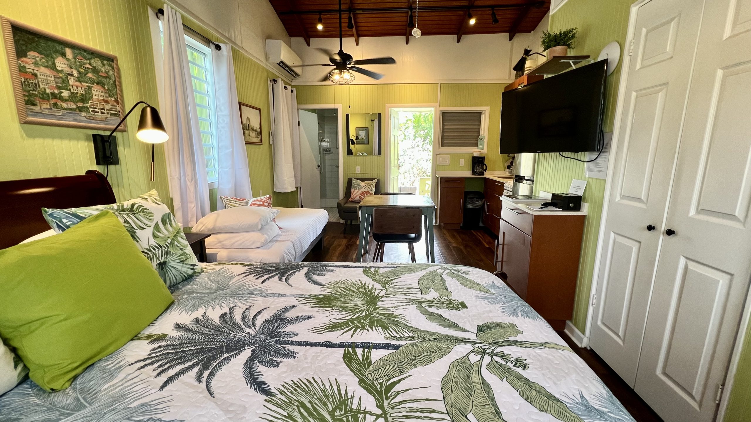 Inside, you’ll find an open-concept main room with a galley kitchen, comfortable living area, and a cozy bunk space—perfect for kids. The villa also includes a pull-out chair that converts to a twin bed, making it ideal for families. The private bedroom connects to a spacious bathroom, and the large outdoor porch is perfect for family meals or relaxing in the island breeze.