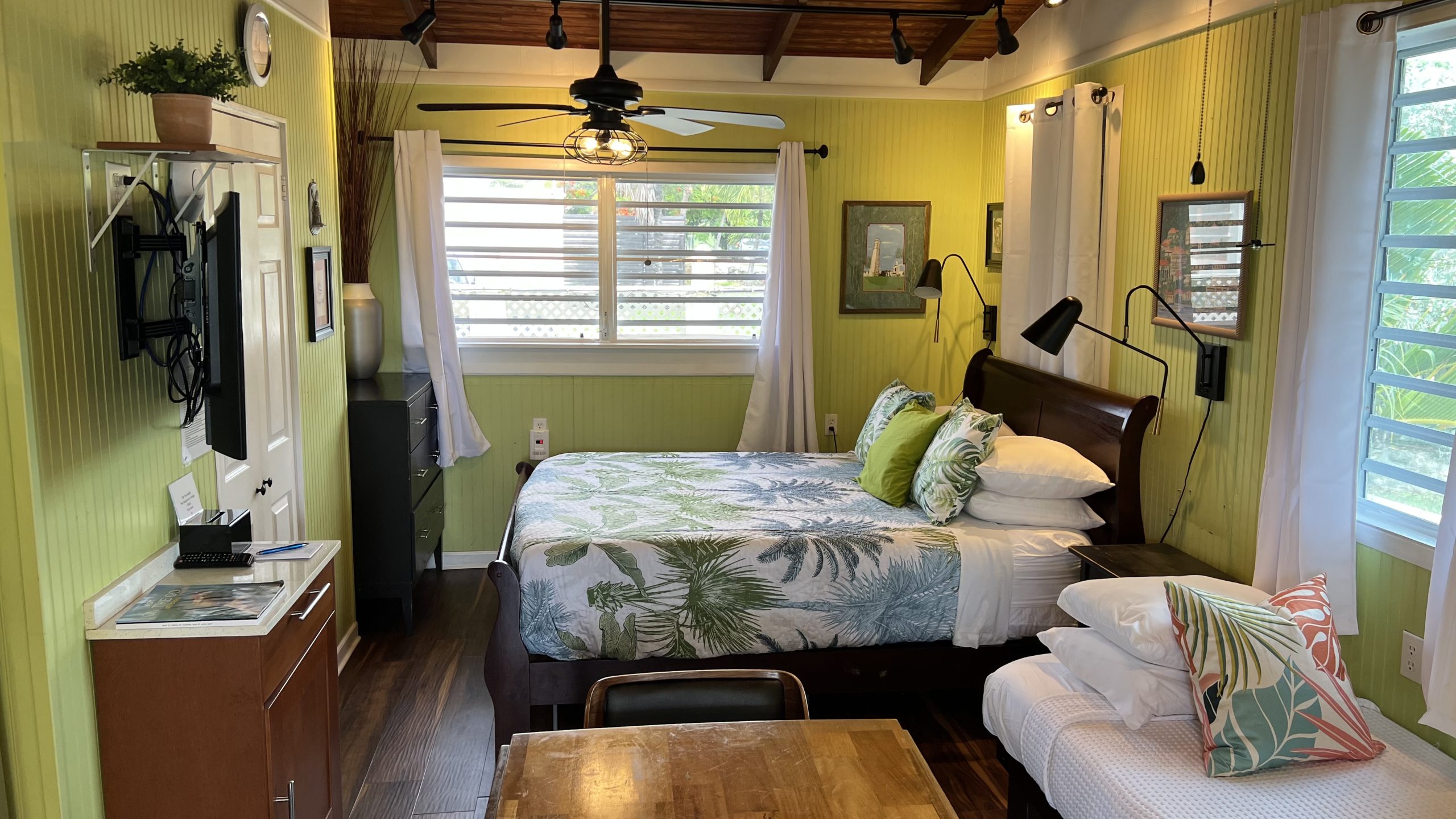 Our Calypso Kay Cottage was named in honor of our longest, oldest and most loyal guest, Kay McCourt, (1917 – 2019) who stayed in this cottage every year and even named the cottage herself. This spacious cottage is located in the rear, center of our property between our Conch Shell and Carol’s Rest Cottages. It features an open concept floorplan with king and twin beds in the main, a galley kitchen, a large bathroom and a spacious patio.