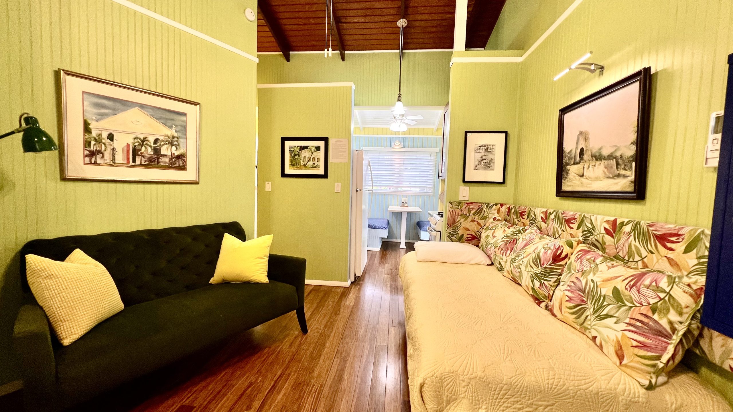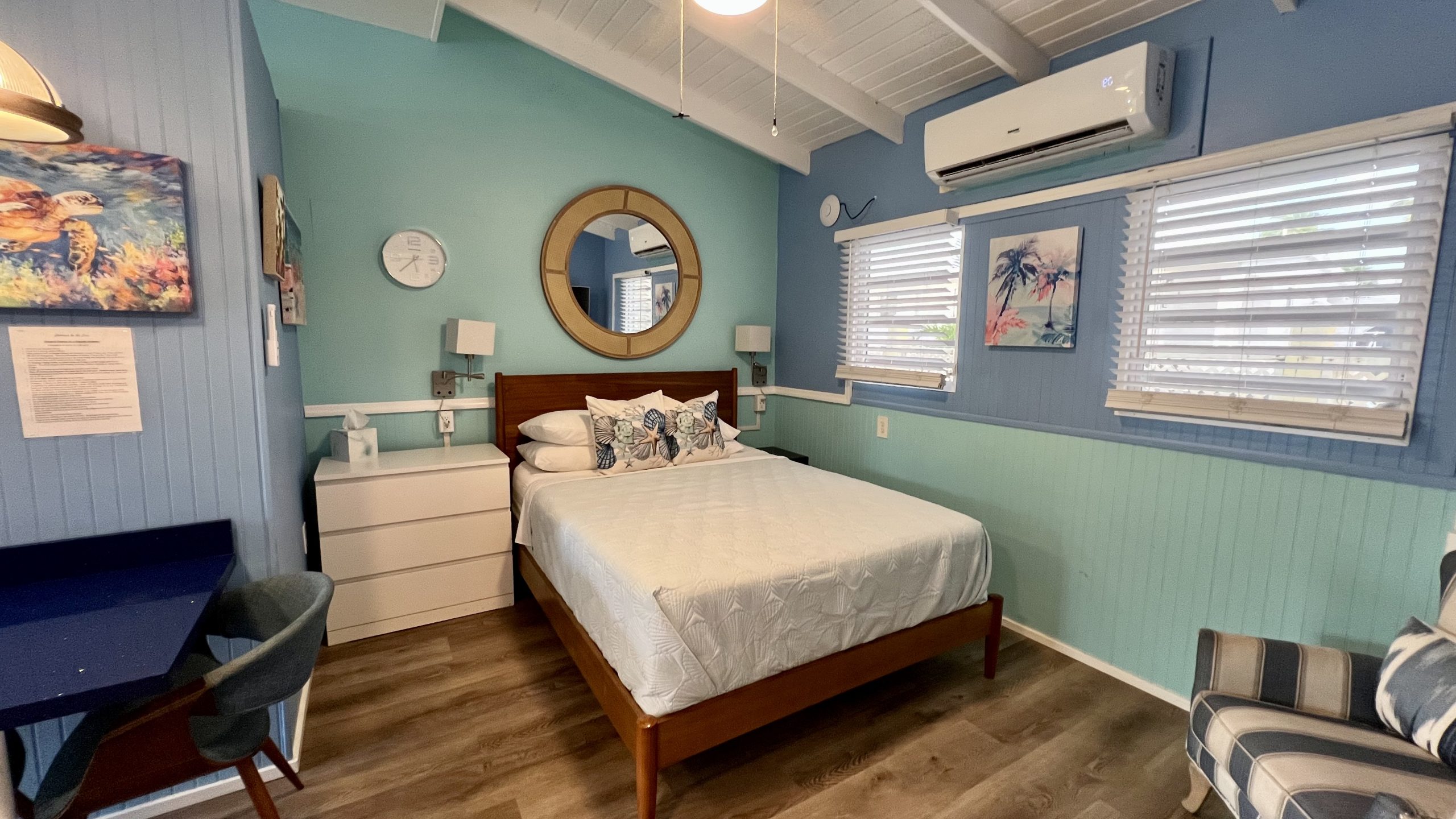 Conch Shell cottage is located near the office in between our Calypso and Cruzan Cottages. It is a smaller cottage with an open concept floor plan and features a galley kitchen, king bed and spacious bathroom. It has a spacious outdoor patio.