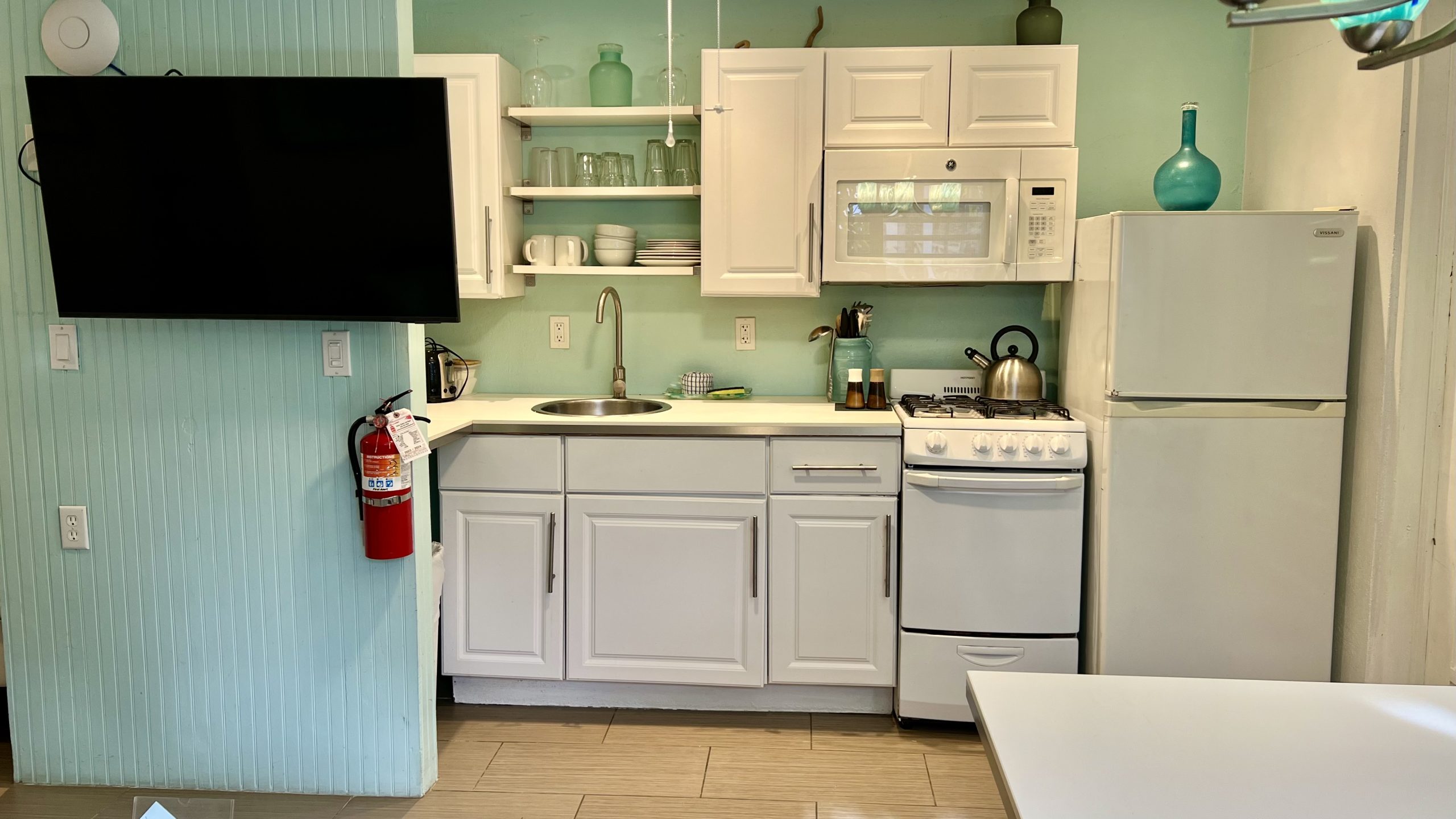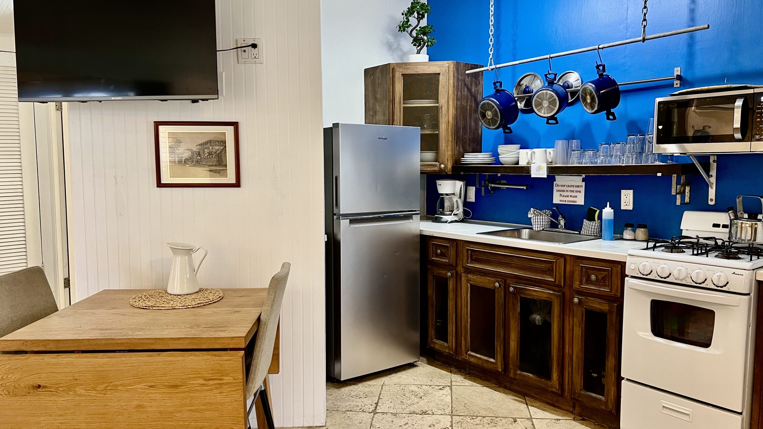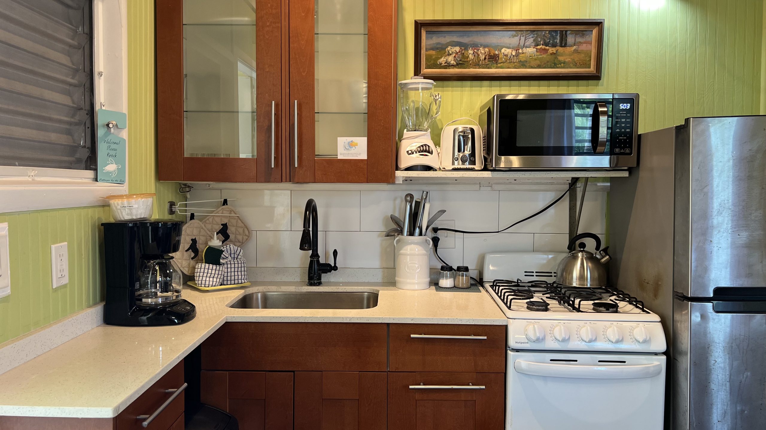 - Full kitchens which include Coffee Maker, Toaster, Microwave, Refrigerator, Stoves with Ovens (except Small Hotel Rooms), Cookware, Plate ware, Silverware, and Utensils