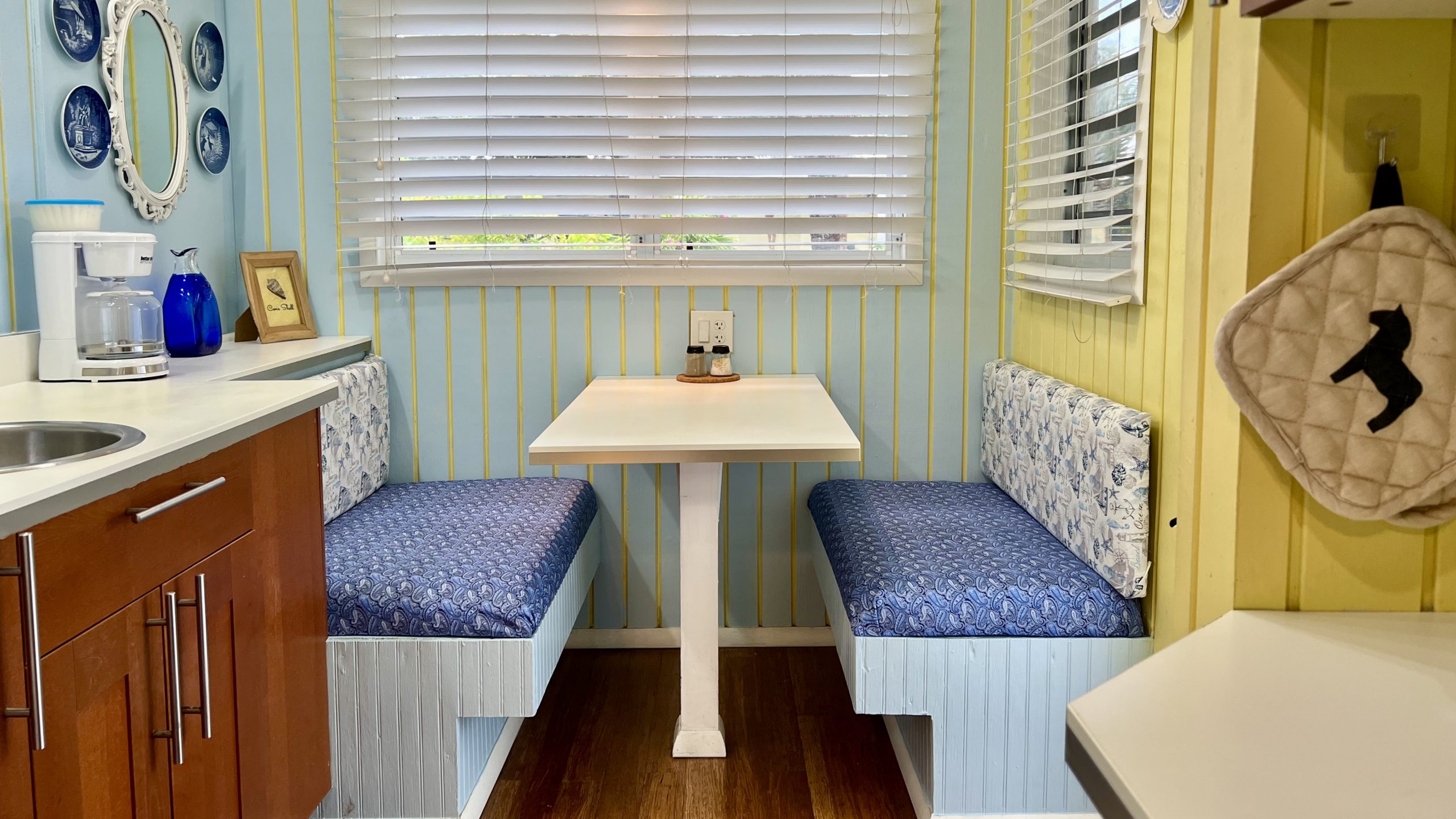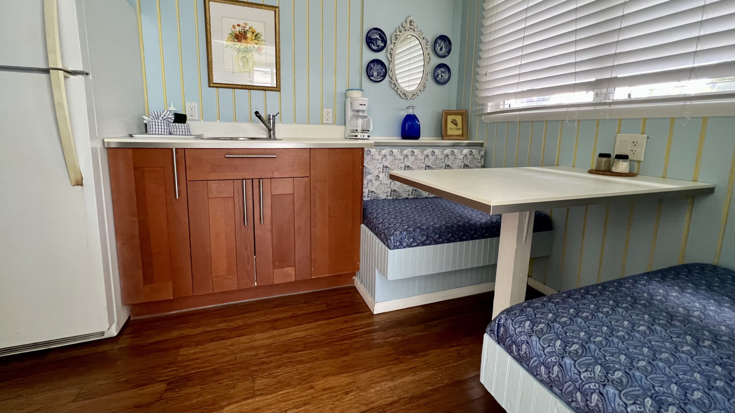 Located between or Castaway and Calypso Cottages, this cottage was designed with a Danish theme because our mother was Danish. Carols’ Rest has an open concept layout with a cozy kitchen in the front of the cottage near the front porch, and a bedroom area in the rear of the cottage. This cottage features a spacious bathroom, queen and twin beds, a built-in dining booth, and a cozy outdoor patio. This room also has the ability to connect to our Castaway cottage.